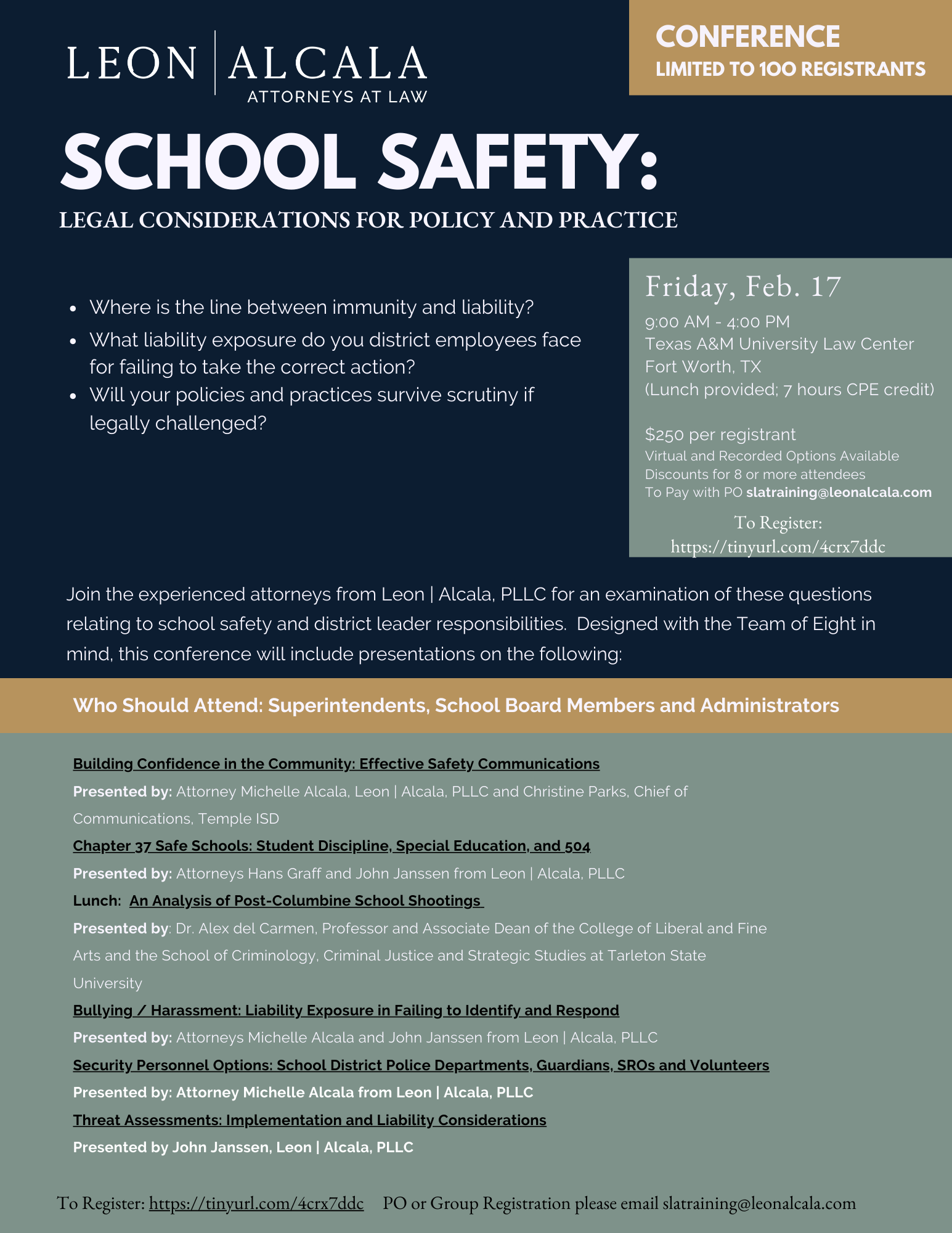 Join the experienced attorneys from Leon | Alcala, PLLC for an examination of these questions in the context of different topics relating to school safety. Designed with the Team of Eight in mind.